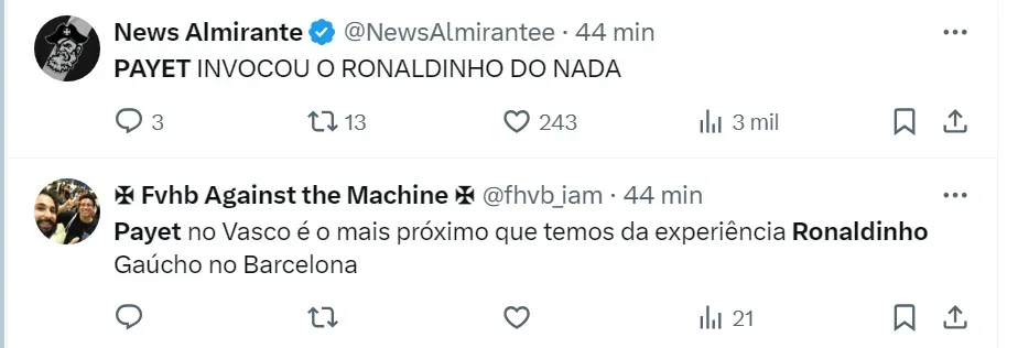 “Payet invocou o Ronaldinho Gaúcho do nada”, disse o perfil News Almirante na rede social. Outros torcedores da Colina comentaram no X (antigo Twitter) que o meia deu um passe ‘estilo Ronaldinho’.