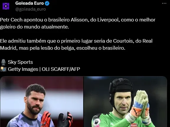 Apesar de Ederson ter sido considerado o melhor goleiro do mundo pela FIFA, Cech acredita ser outro brasileiro: “Essa temporada Courtois estava machucado, então eu vou de Alisson”, comentou.