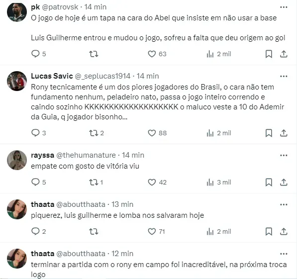 A essa altura do jogo, apesar do Palmeiras crescer na partida e quase virar a parada, o que incomodava a torcida palmeirense nas redes sociais era o fato do meia Rômulo não ser acionado por Abel para entrar.