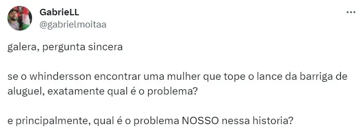 “Filho não deveria servir para curar dor de ninguém. Absolutamente ninguém vai substituir o filho que você perdeu, nem um biológico, nem um adotivo”, disparou um seguidor, ofendendo Whindersson.