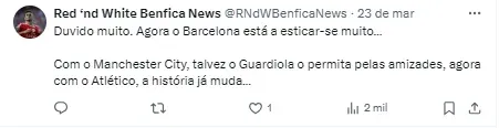 Ele comentou em entrevista ao jornal espanhol “Mundo Deportivo”, que a oferta por Cancelo estava nas mãos do empresário do atleta. Porém, as tratativas precisam da aprovação do Manchester City, que detém os direitos econômicos do jogador.