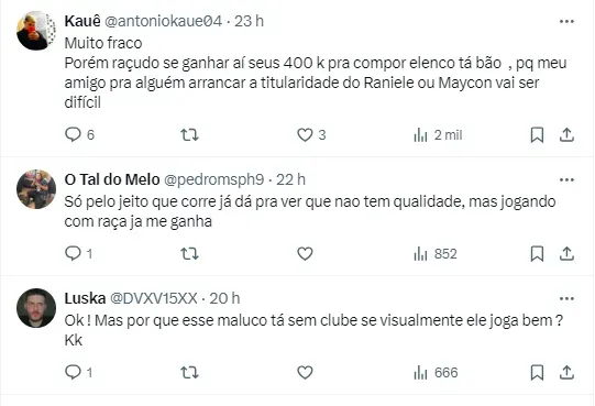 “O que pesa contra o Xeka é o fato dele não jogar há bastante tempo. Está desempregado, livre no mercado desde a metade do ano passado quando não renovou seu contrato com o Rennes, da França”, disse em seu canal no YouTube.