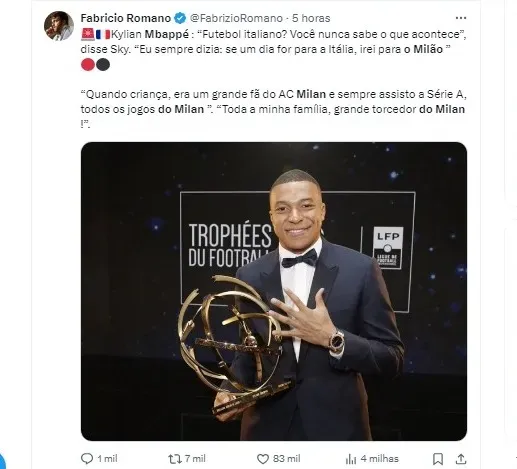 Embora seu destino imediato pareça ser o Real Madrid, Mbappé não escondeu seu amor pelo Milan. Em entrevista à Sky, ele revelou seu sonho de infância de jogar pelo clube italiano.