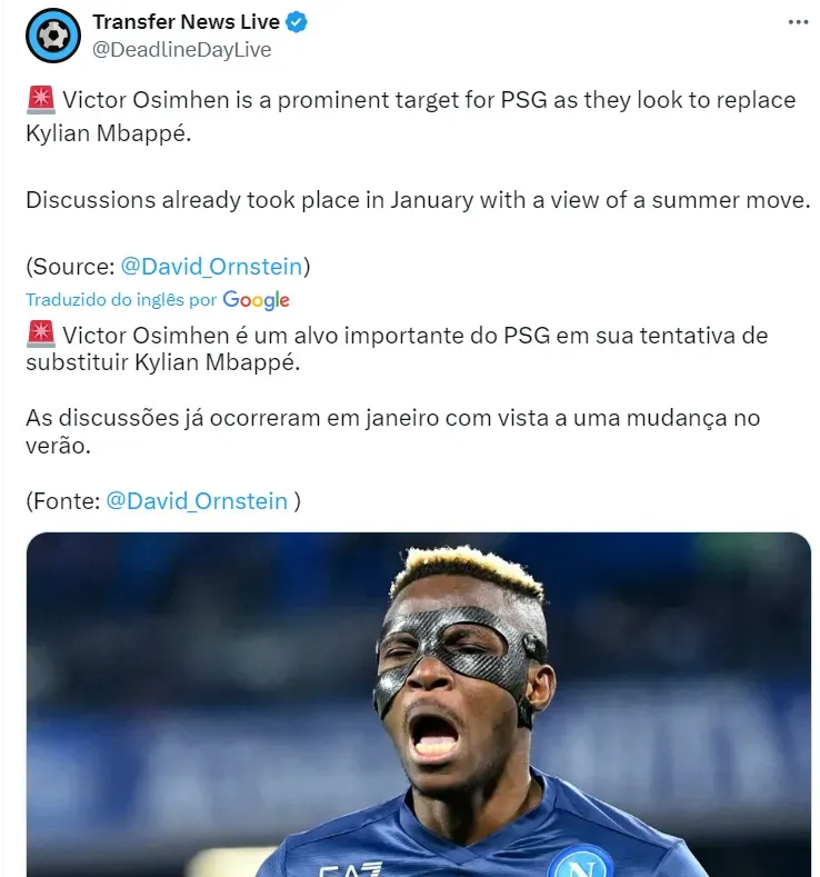 O atacante Osimhen é a bola da vez dentro do PSG para o lugar de Mbappé. Segundo David Ornstein, o clube de Paris mantém conversas com o atacante desde janeiro.