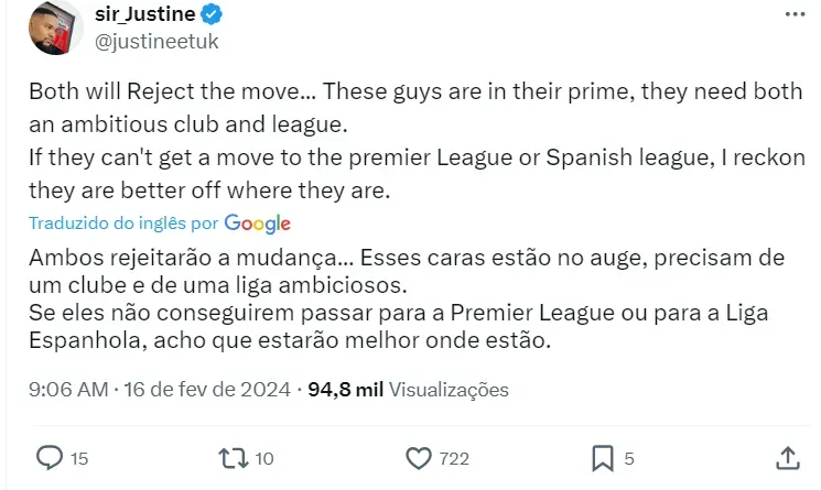 O Man City não tem nenhuma intenção de fazer negócio envolvendo um dos seus grandes craques, mas o entendimento é que o português vê com bons olhos viver um novo desafio.