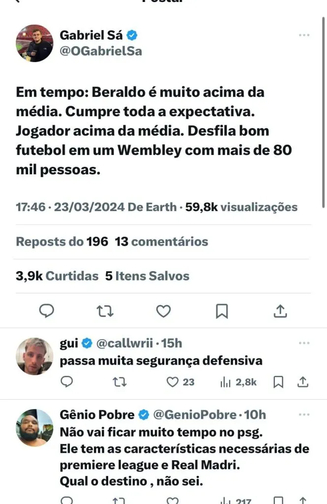 Em publicação, os espanhóis se renderam ao atleta: “Beraldo se destacou pela qualidade e frieza no controle da bola e, em um cenário como o de Wembley, conseguiu demonstrar sua capacidade de mandar bolas precisas aos companheiros dispostos a ir mais fundo no ataque”, disse.