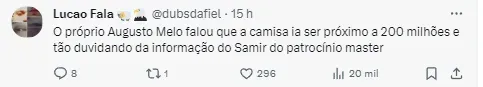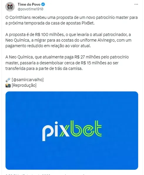“O Corinthians recebeu uma proposta de um novo patrocínio master para a próxima temporada da casa de apostas PixBet. A proposta é de R$ 100 milhões, o que levaria o atual patrocinador, a Neo Química, a migrar para as costas do uniforme Alvinegro, com um pagamento reduzido em relação ao valor atual”, publicou o perfil.