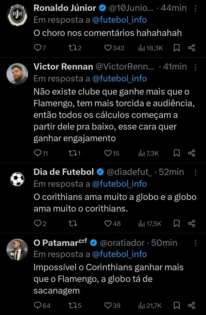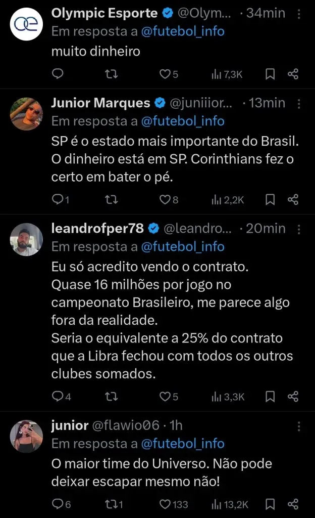 “Fontes do mercado revelam que o valor se aproxima dos R$ 300 milhões por ano, por se tratar do clube com a maior torcida de São Paulo. Além disso, o Timão é considerado indispensável para atender os patrocinadores da Globo”, continua.
