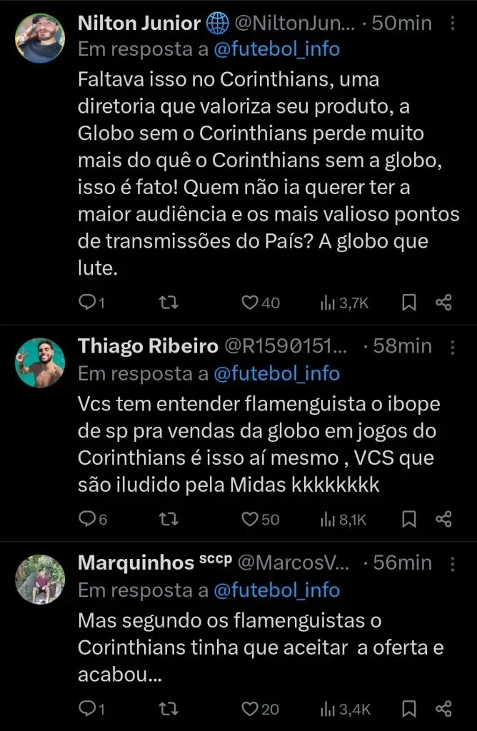 “Nos bastidores da emissora, esse já é um tema decidido: tem que fechar com o Corinthians de qualquer forma, e o mais rápido possível”, disse.