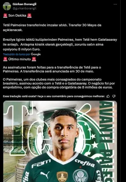 Trata-se do ponta-direita Tetê, cria da base do Grêmio, que atualmente está no Galatasaray, da Turquia. Segundo o jornalista turco, Gurkan Borangil, o jogador tem negociações praticamente encaminhadas para um desfecho positivo para a transferência ao Palmeiras.