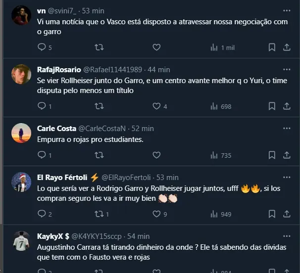 Dito isso, por mais que conte com Matías Rojas em seu elenco e esteja muito perto de contratar Garro, o Corinthians ainda não desistiu da contratação do meia Benjamín Rollheiser, do Estudiantes (ARG).