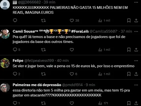 A presidente do Palmeiras fica em boas condições caso as tratativas avancem, visto que a torcida vê com bons olhos uma avaliação inicial perante o Garoto do Ninho e só assim ocorrer um investimento mais alto.