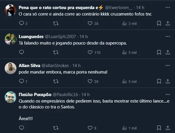 Desse modo, o Tricolor Paulista e o empresário do jogador seguem com impasse e a tendência é que novos capítulos apareçam. De qualquer maneira, os torcedores não gostaram da atuação do jogador na noite deste sábado (17) e a renovação virou tema de críticas.