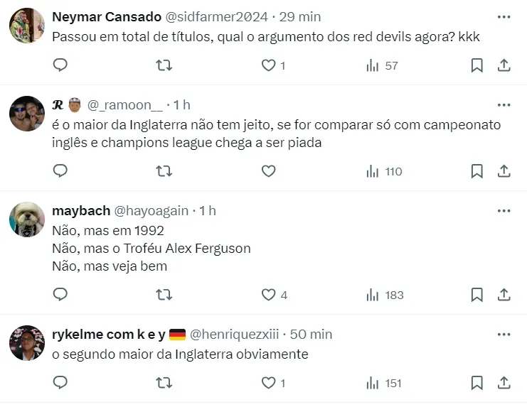 Com 67 taças, o Manchester United é o segundo clube da Inglaterra com mais títulos conqusitados na história. Depois, aparece o Arsenal, com 49, e Manchester City e Chelsea, ambos com 34.