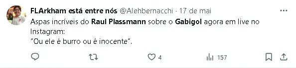“Você não acha nada demais, mas a torcida acha. ‘Então, não devo fazer isso aqui’. Ele não tem consciência nenhuma. Ou ele acha que é maior que o Flamengo. ‘Dane-se. Sou o Gabigol’. Ele é tão nocivo ao Flamengo que ele dividiu a torcida. Existem torcedores a favor e torcedores contra. Ele cria uma situação horrorosa para o time. Ele divide a maior torcida do planeta”, acrescentou Plassmann.
