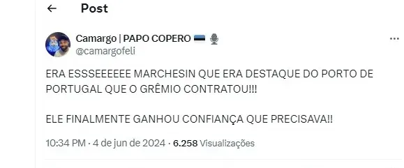 ERA ESSSEEEEEE MARCHESIN QUE ERA DESTAQUE DO PORTO DE PORTUGAL QUE O GRÊMIO CONTRATOU!!! ELE FINALMENTE GANHOU CONFIANÇA QUE PRECISAVA!! Disse o torcedor Camargo na rede social X