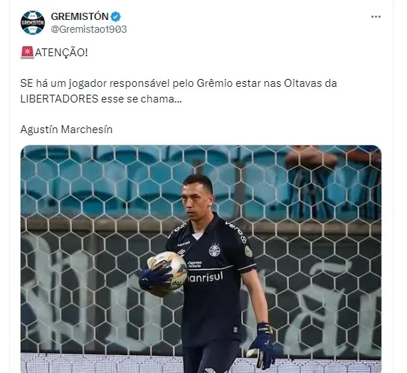 Na sequência, o perfil Gremistón elogiou a atuação do goleiro Gremista: