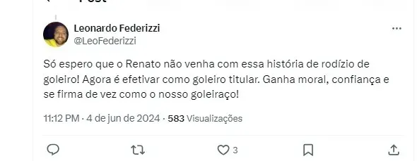 “Só espero que o Renato não venha com essa história de rodízio de goleiro! Agora é efetivar como goleiro titular. Ganha moral, confiança e se firma de vez como o nosso goleiraço! “disse o torcedor Leandro