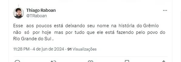 Esse aos poucos está deixando seu nome na história do Grêmio não só por hoje mas por tudo que ele está fazendo pelo povo do Rio Grande do Sul . lembrou o torcedor Thiago