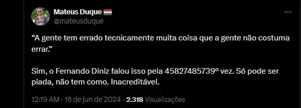 Sim, o Fernando Diniz falou isso pela 45827485739º vez. Só pode ser piada, não tem como. Inacreditável.