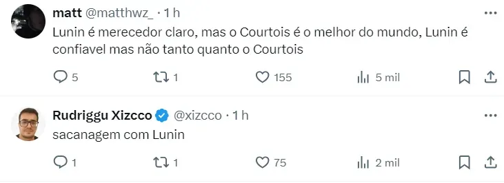 O plano de Ancelotti é começar com Courtois na grande final da Champions League, contra o Borussia Dortmund. Lunin tem grande confiança do italiano, mas é belga que tem a preferência.