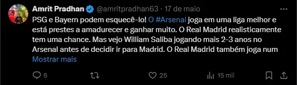 O Real Madrid está próximo de realizar uma proposta para contratar William Saliba, do Arsenal, segundo o Team Talks. O zagueiro francês é uma das principais peças do time de Mikel Arteta e tem se destacado nas últimas temporadas com a camisa do clube inglês.