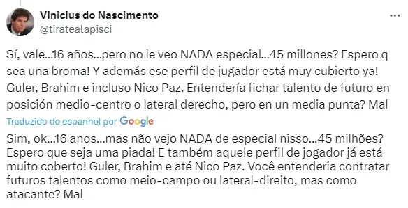 O time argentino pede algo entre 45 milhões de euros – cerca de R$ 257 milhões na atual cotação da moeda. Mastantuono, inclusive, já soma 18 jogos pelo time profissional.