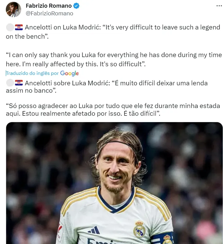 O croata Modric, de 38 anos de idade, está com seus dias contados com as cores do Real Madrid e tende a deixar o clube merengue no final da temporada, conforme informações da mídia espanhola.