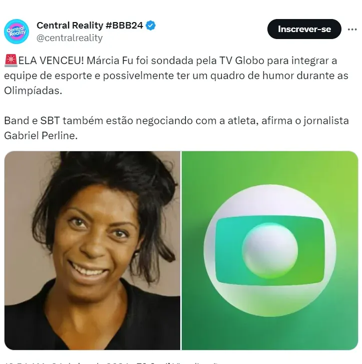 Vale destacar que nenhuma proposta oficial foi feita pela Globo para Márcia Fu. Aconteceu apenas uma conversa entre a empresária da ex-atleta e um executivo sobre “possibilidades de trabalho”.