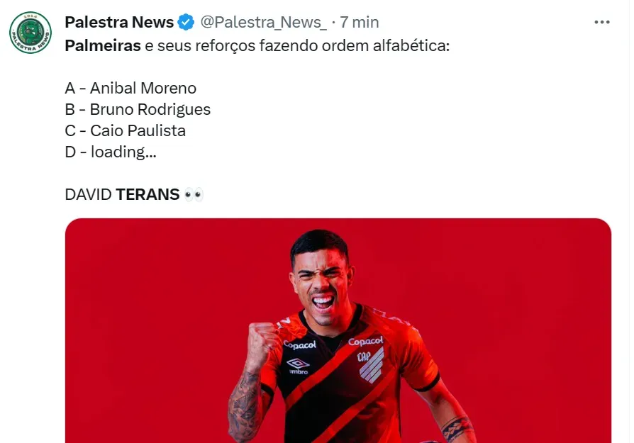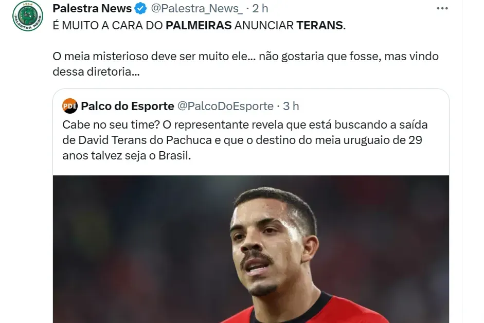 Em julho do ano passado, o Athletico vendeu Terans por R$ 18 milhões aproximadamente para o Pachuca. “Muito a cara do Palmeiras anunciar o Terans”, completou outro torcedor do Verdão no atual X.