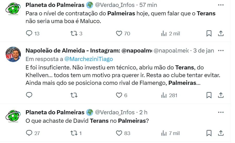 “Para o nível de contratação do Palmeiras hoje, quem falar que o Terans não seria uma boa é maluco”, comentou um perfil de palmeirenses no X. “Barato, já conhece o Brasil e por empréstimo é ok”, opinou outro.
