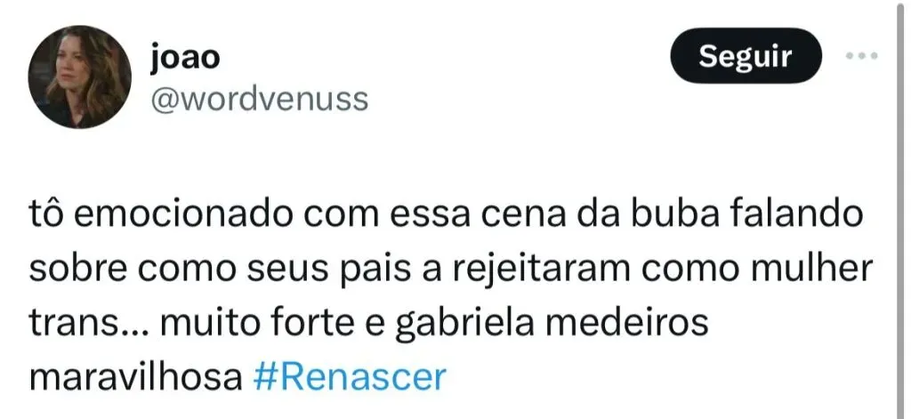 Por isto, após a morte de seu amado, ela abrirá o jogo para os seus pais sobre realmente quem ela é. Buba contará aos seus genitores que é uma mulher trans