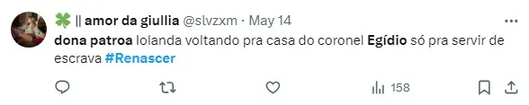 No próximo capítulo de Renascer, da TV Globo, Egídio (Vladimir Brichta) irá acabar brochando com a sua esposa, Dona Patroa/Iolanda (Camila Morgado). Em contrapartida, o vilão vai fazer uma proposta ousada à mulher.