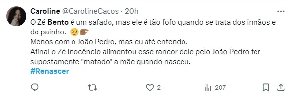 Nos próximos capítulos de Renascer, da TV Globo, José Bento (Marcello Melo Jr.) e José Augusto (Renan Monteiro) vão reclamar de começar a trabalhar nas roças de cacau, a mando de José Inocêncio (Marcos Palmeira).