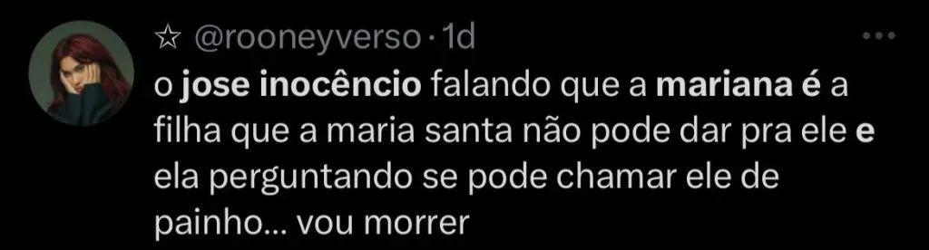 Em seguida, Mariana diz que gostou da forma como o coronel olhou para ela na noite passada. Ele pergunta de qual forma e ela responde: “Painho me olhô como mulé! Eu acho que painho tem que enterrá Maria Santa d’uma vez por todas”, dispara.