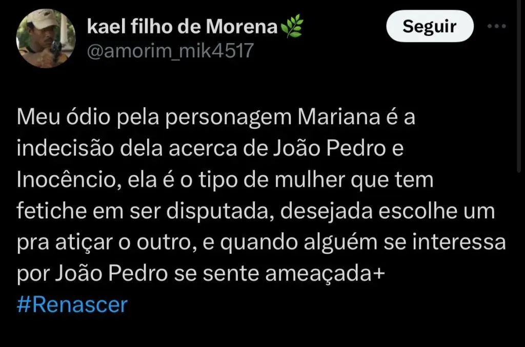 Após a reação do garoto, a jovem vai se declarar: “Mas descobri que você é o meu amô”. O filho de Inocêncio perguntará sobre o que ela sente por seu pai.