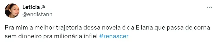 Logo após José Venâncio (Rodrigo Simas) morrer, Eliana (Sophie Charlotte) viverá um novo romance em Renascer. De início, ela se envolverá com Damião (Xamã), que trairá Ritinha (Mell Muzzillo).