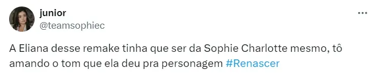 Em alta na emissora, Sophie Charlotte já trabalhou em outros dois remakes na Globo antes de Renascer: O Rebú e Ti Ti Ti. Na primeira versão, foi Patrícia Pillar quem interpretou Eliana.