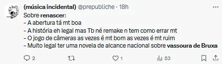 Ao verem o problema sendo retratado em Renascer, vários telespectadores falaram sobre o assunto nas redes sociais: “Eu nem sabia que nessa 1º fase em renascer eles vão falar da vassoura-de-bruxa, agora eu quero assistir“, comentou uma telespectadora. “Que interessante essa história da vassoura-de-bruxa. Não conhecia“, disse outra.