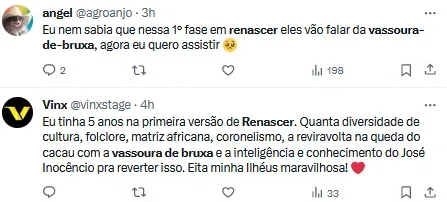 Ao verem o problema sendo retratado em Renascer, vários telespectadores falaram sobre o assunto nas redes sociais: “Eu nem sabia que nessa 1º fase em renascer eles vão falar da vassoura-de-bruxa, agora eu quero assistir“, comentou uma telespectadora. “Que interessante essa história da vassoura-de-bruxa. Não conhecia“, disse outra.