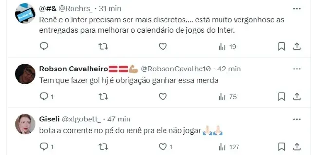 “@SCInternacional é sério o que vocês estão deixando esse técnico fazer com o clube? De onde Renê pode jogar como titular?” ”Depois do último jogo que destruímos os caras por 40 minutos empilhando chance… eu fico muito puto porque o inter não consegue botar a porra da bola pra dentro do gol e sempre o fdp do Renê falha quando o jogo vale algo”, desabafou dois torcedor do Internacional no X.