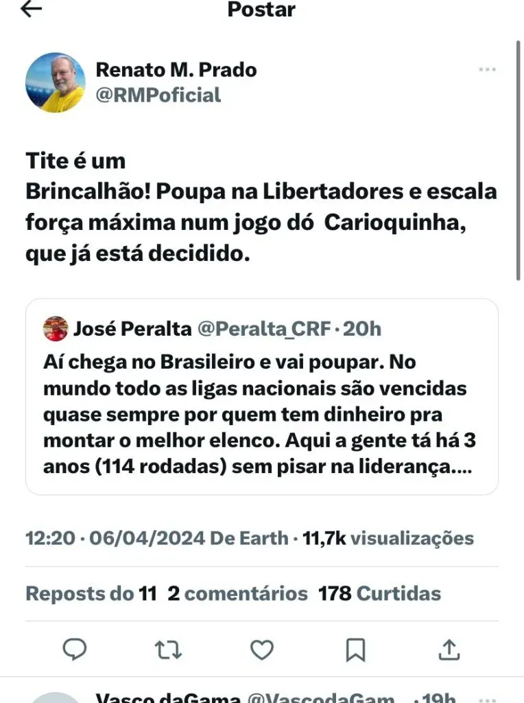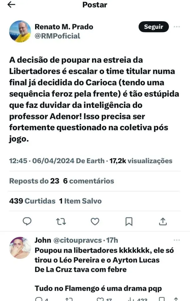 Nas redes sociais, ele falou sobre a escola de Tite: “(SIC) A decisão de poupar na estreia da Libertadores é escalar o time titular na final já decidida do Carioca (tendo uma sequência feroz pela frente) é tão estúpida que faz duvidar da inteligência do professor Adenor! Isso precisa ser fortemente questionado na coletiva pós jogo”, disse.