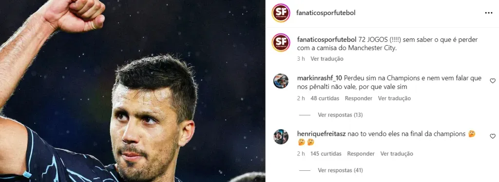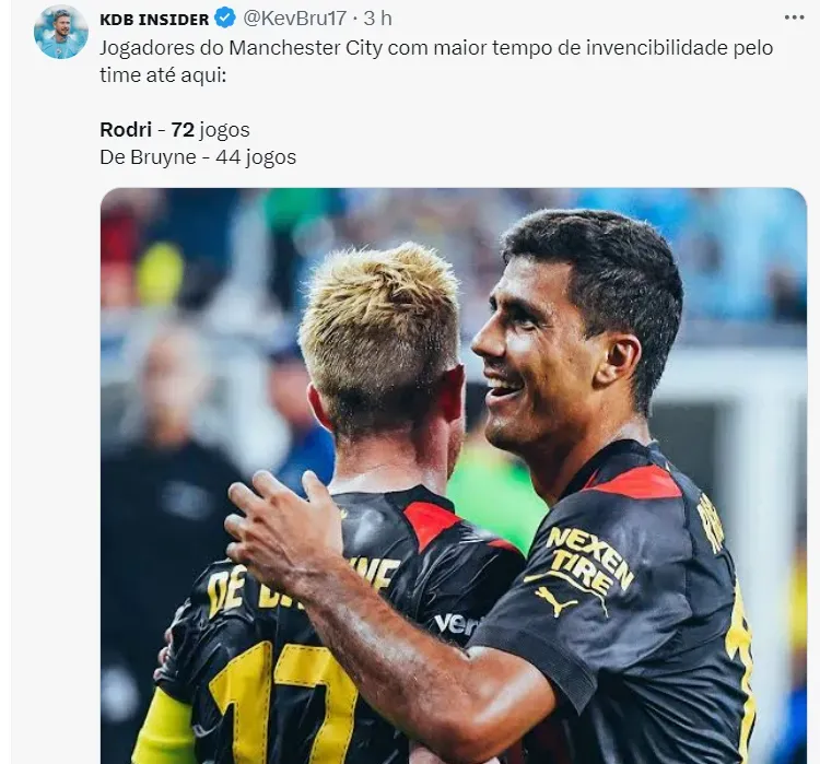 A última derrota de Rodri vestindo as cores do City foi no dia 05.02.2023, em um jogo contra o Tottenham. Contando seleção, são 71 jogos sem perder – a última derrota foi para a Escócia, em 2023.