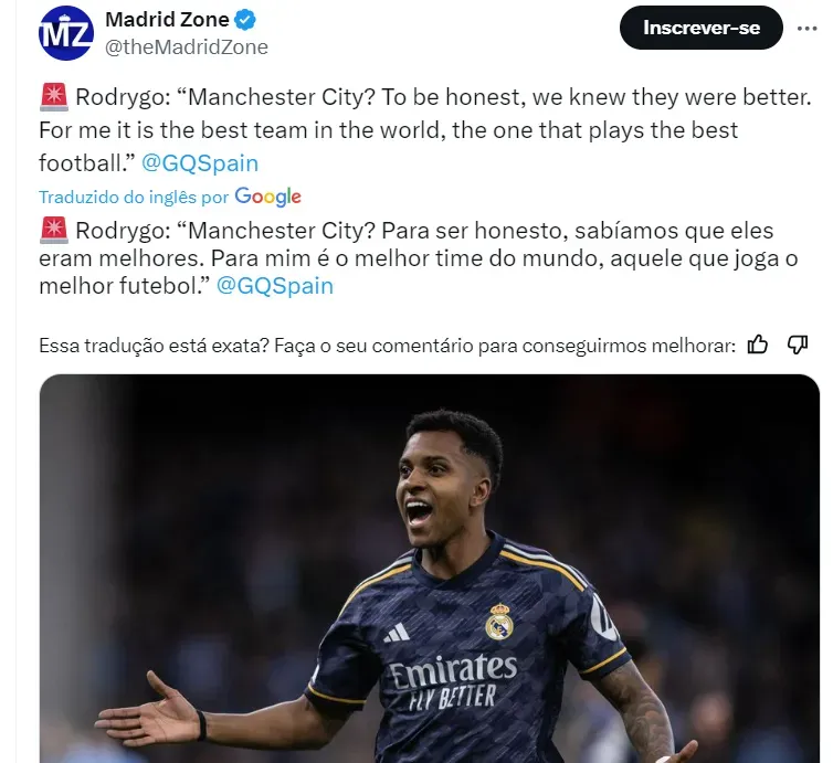 “Manchester City? Para ser honesto, sabíamos que eles eram melhores. Para mim, é o melhor time do mundo, aquele que joga o melhor futebol. Mas temos algo especial. Não consigo explicar”, disse Rodrygo.