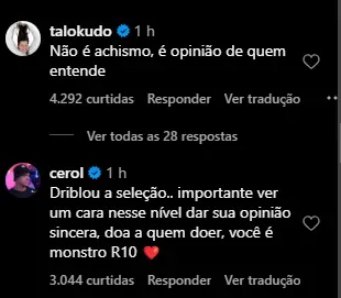 Na sequência da publicação, Ronaldinho Gaúcho, lembrado como um dos melhores do mundo, detonou o desempenho da Seleção. “Repito: nosso desempenho tem sido uma das piores coisas que já vi. Uma vergonha”, reclamou.