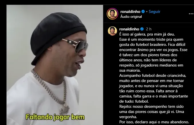 Em publicação no seu Instagram, o craque Ronaldinho Gaúcho criticou os jogadores do Brasil e revelou que não acompanhará a Seleção, que ajusta a sua defesa, na Copa América.