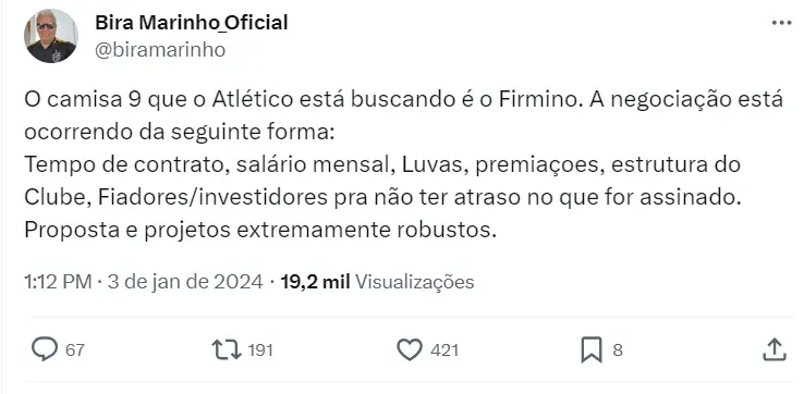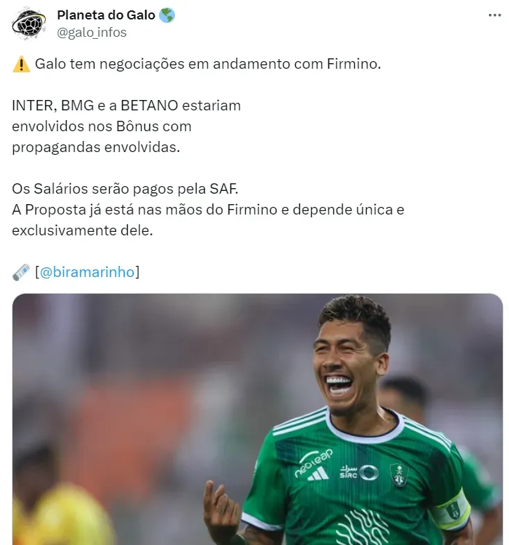 De acordo com Bira Marinho, o Atlético-MG está em conversas com Roberto Firmino neste momento. Os patrocinadores INTER, BMG e Betano estariam envolvidos em um possível acerto, que seria histórico.