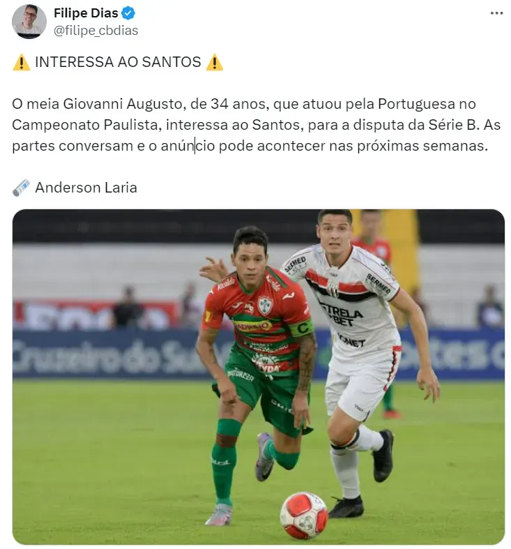 O meia veterano Giovanni Augusto é o mais novo alvo do Santos no mercado e um acordo pode acontecer. O jogador está livre no mercado após passagem pela Portuguesa e chegaria a custo zero no Peixe.