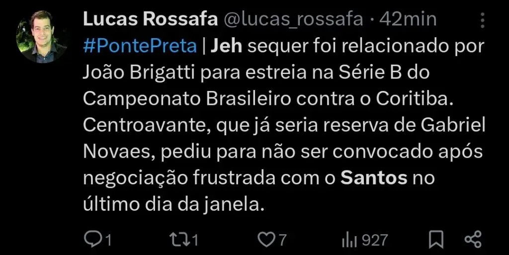 Inclusive, o negócio só não foi fechado na última sexta (19) em virtude de uma falta de acordo entre os times, já que o Santos almejava um empréstimo e a Ponte uma venda.