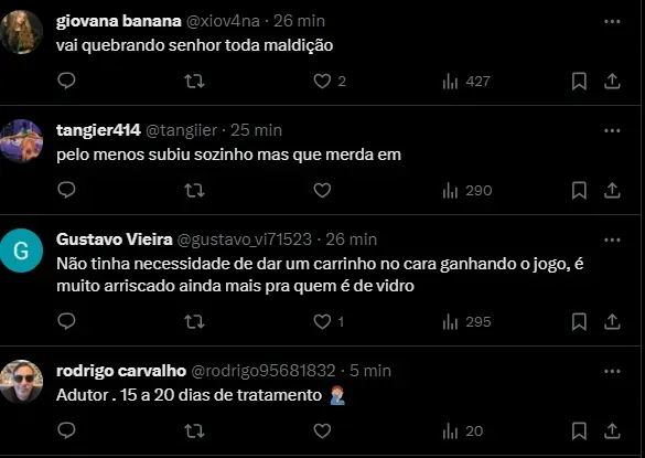 “São Paulino tendo um total de 0 dias de paz”, “Já aviso que se o Lucas tiver se machucado não vou mais assistir nenhum jogo” e “Deus, faça com que o Lucas não tenha se machucado”, foram algumas da reações.